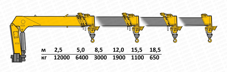 Кран-манипулятор XCMG SQS 300-5 имеет грузоподъемность 12 000 кг и грузовой момент 30 т·м. Максимальный вылет стрелы составляет 18,7 метра, а максимальная высота подъема — 21 метр. Стрела состоит из 4 секций, может подниматься под углом до 75°, кран вращается на 360° непрерывно со скоростью 3 оборота в минуту. Система охлаждения предусмотрена для надежной работы при высоких нагрузках.